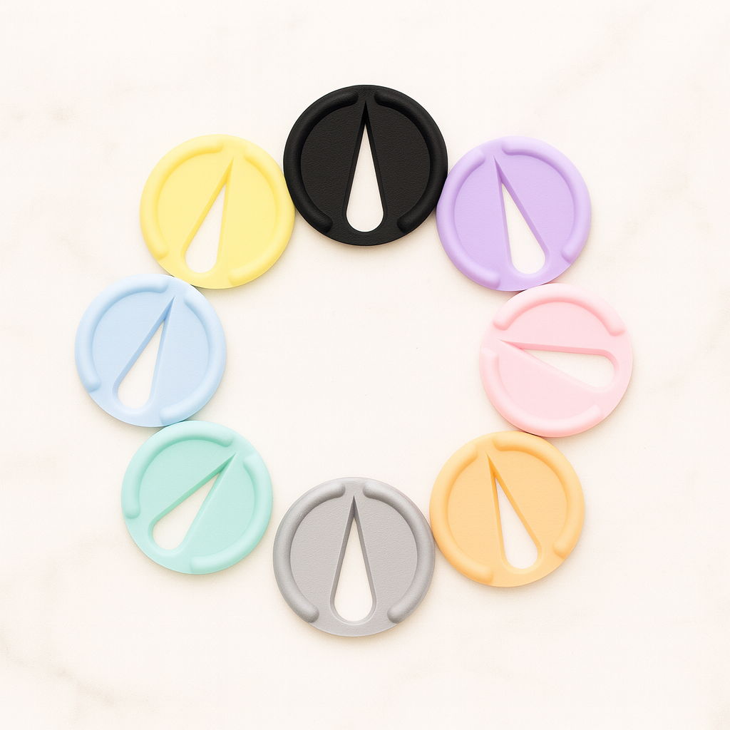TickTag ist in 8 verschiedenen Farben erhältlich: Apricot, Blau, Gelb, Mint, Rosa, Schwarz, Silber und Violett. Alle Farben sind in derselben Größe gefertigt und lassen sich frei kombinieren.